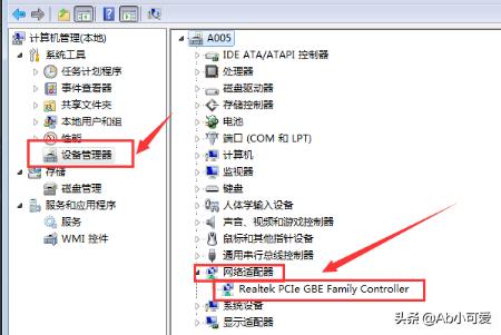 1、鼠标右键点击【我的电脑】--【管理】--【设备管理器】,查看是否有【网络适配器】设备。点击后,里面是否有网卡的驱动程序。