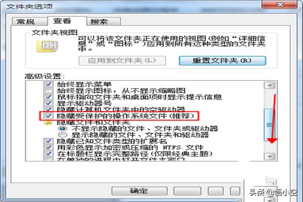 5.向下拉右边的滚动条,找到隐藏受保护的操作系统文件把前面的勾去掉。
