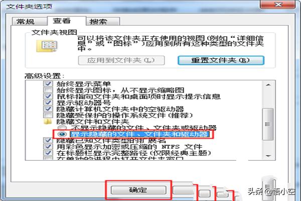 7.点击显示隐藏的文件、文件夹和驱动器前面的圆圈,点击应用,确定。