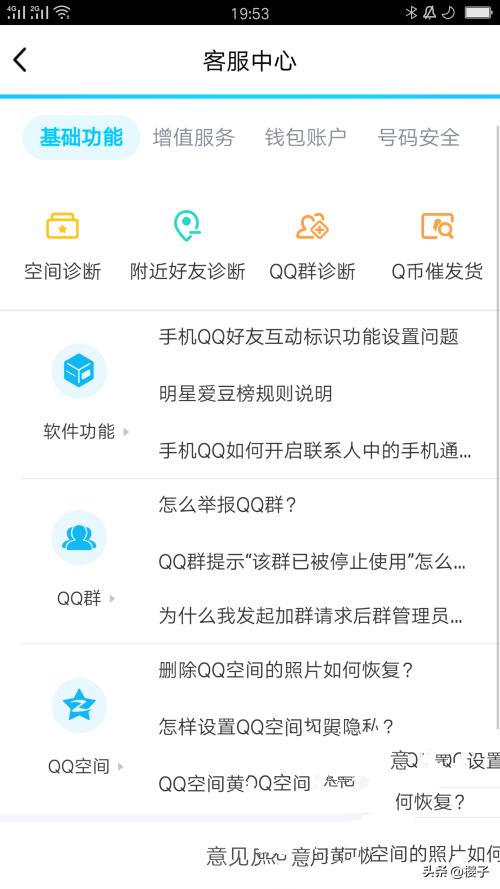 7、摁下基础功能,开启软件功能下的基础功能界面找到手机QQ好友恢复问题,打开它就可以看到一个网址来恢复删除好友,如图
