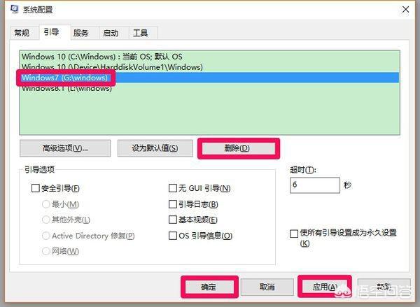 2、在打开的系统配置窗口,点击:引导,在引导标签下点击要删除的引导项-删除,