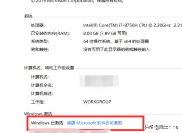 2、打开属性面板后我们在可以看到在Windows激活列表中显示“Windows已激活”,说明我们的win10系统是正版的,不是盗版的。