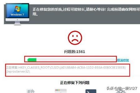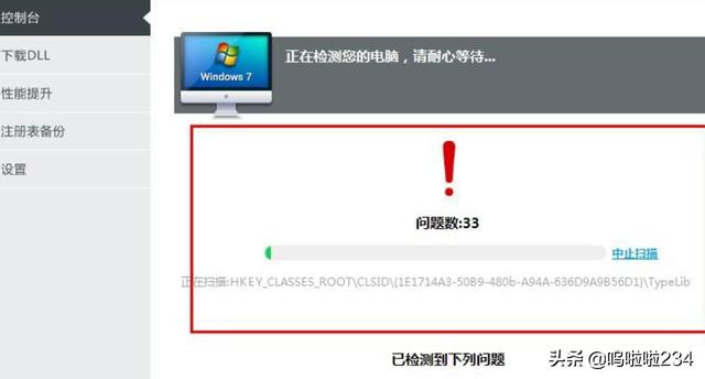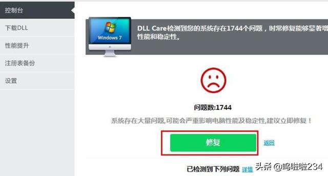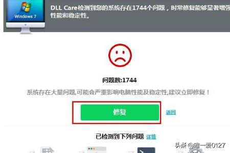 4、扫描完成后,会显示电脑的问题数量,以及对应的问题类型,这里主要就四大类:注册表问题、dll问题、sys问题和exe问题,直接点击修复选项即可。