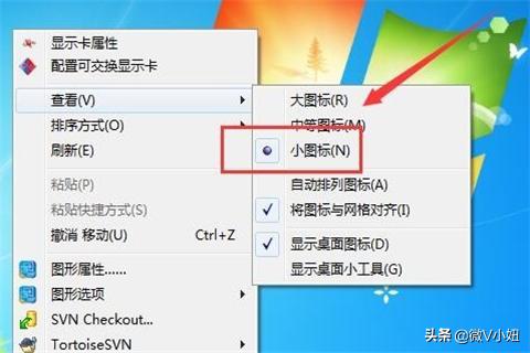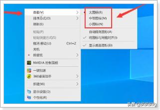 鼠标右键单击桌面空白处,选择查看,可以看到大、中、小三种图标,选择喜欢的一种图标大小,就可以看到桌面图标的变化。