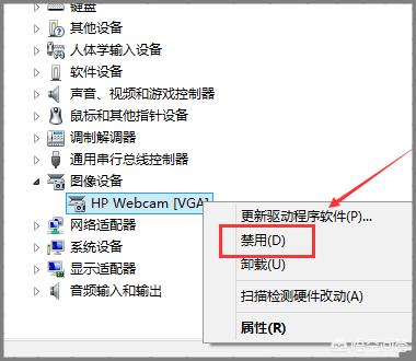5、点击成功后,那么刚对着它右击的那个小图标上面就会有一个红色的叉,这样就在设备管理器里面,就把电脑上的摄像头禁用了。
