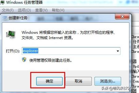 3)在弹出的“创建新任务”对话框中输入“explorer”点“确定”完成桌面图标的恢复和显示。