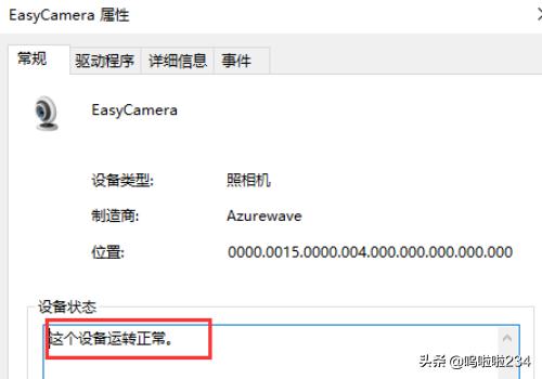 3、双击进入,如果框里显示内容为这个设备运转正常,说明你的摄像头功能打开了,如果显示的是禁用,我们就需要解除禁用。点击【驱动程序】,再点击【禁用设备】,确认,这个时候会弹出对话框提醒你是否解除禁用,点击确认。