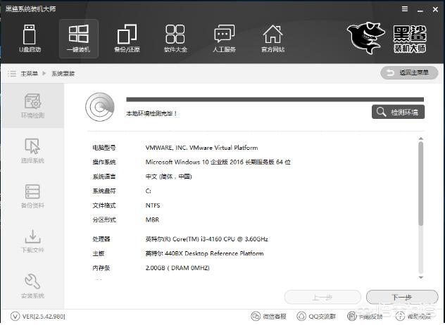 黑鲨会优先检测本地环境是否符合装机条件,检测完毕后点击下一步