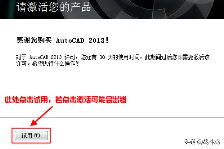 7、在桌面上找到AutoCAD2013程序,点击打开程序。初始化后会出现,Autodesk许可对话框,这里我们选择“试用”如图所示。