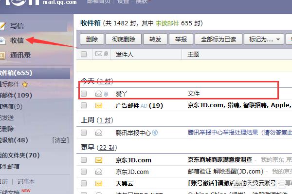 2、进入到QQ邮箱以后点击收信,可以看到收到的电子邮件,点击该电子邮件进入。