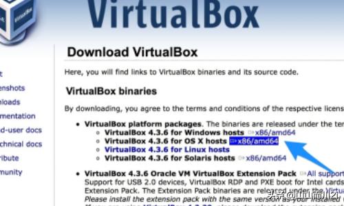 1、这里要用到的一款虚拟是来自Virtual Box的免费虚拟机。我们先打开虚拟机的下载页面: https://www.virtualbox.org/wiki/Downloads,在页面中点击“VirtualBox 4.3.6 for OS X hosts x86/amd64”下载链接,如图所示。