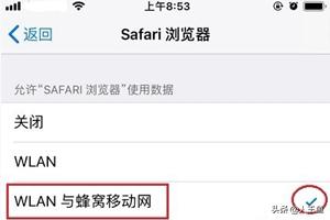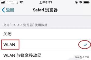 7、第七步如果想要Safari浏览器只能在无线WIFI(即WLAN)状态下使用,则点击选择【WLAN】即可,如图所示。