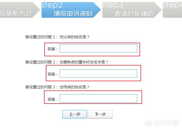 5、填写申诉资料,可以填写你曾设置过的问题,有三个问题,如果忘记答案可以直接点击下一步;