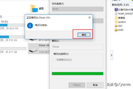 2、在格式化U盘的窗口中,把U盘文件系统格式选成【NTFS格式】,然后勾选【快速格式化】,点击开始,等待格式化完成后,点击确定。