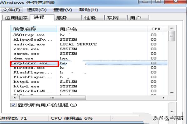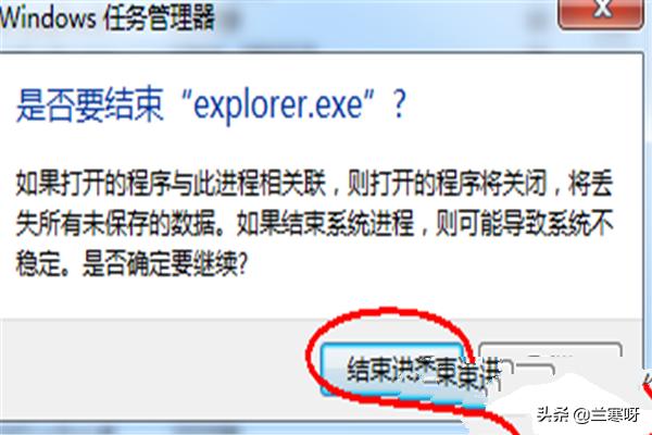 找到“进程”选项卡---- 找到 explorer进程,点击结束进程,并确定 如下图
