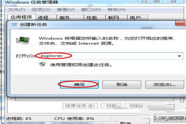 然后点击,新建任务,在任务新建打开选项输入 explorer 确定即可,您在查看任务栏您会发现,之前打开的窗口又正常恢复了