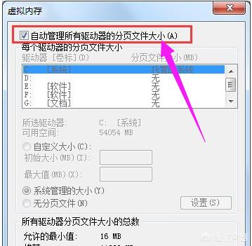 5去掉“自动管理所有驱动器的分页文件大小”复选框。