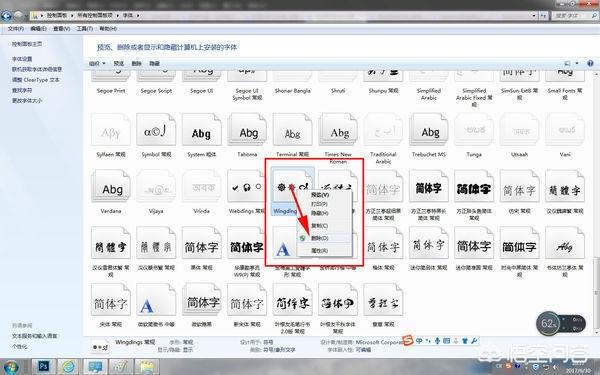 3、打开“电脑--控制面板--字体”,选择不需要的字体,右键删除,可以删除不常用字体。