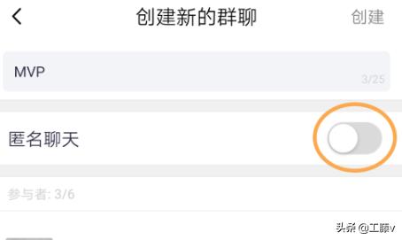 2.在「添加群成员」页面,选择要添加的群成员。选择完成后点击右上角的「继续」,进入创建新的群聊页面。在创建群聊页面中输入群名称,对该群开启匿名聊天。然后点击右上角的「创建」,一个匿名聊天群就创建好了。